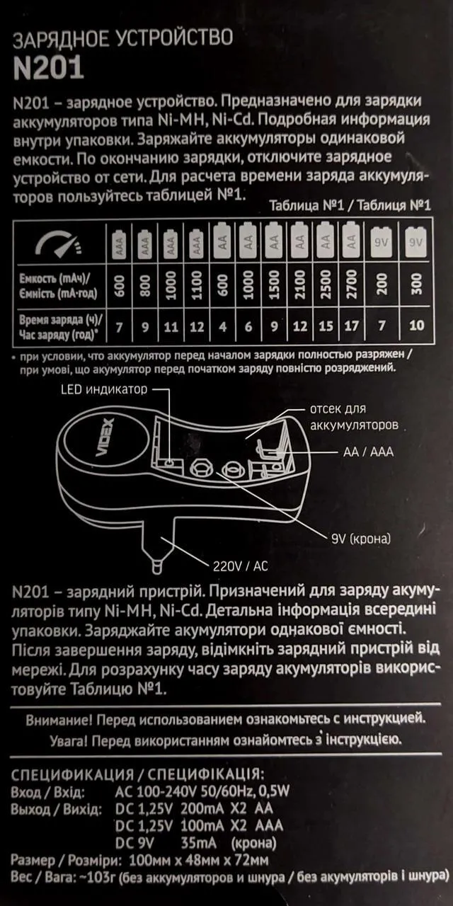 Мзп "Videx" N201 (1-2 акум., AA/AAA, 150mAh+КРОНА)